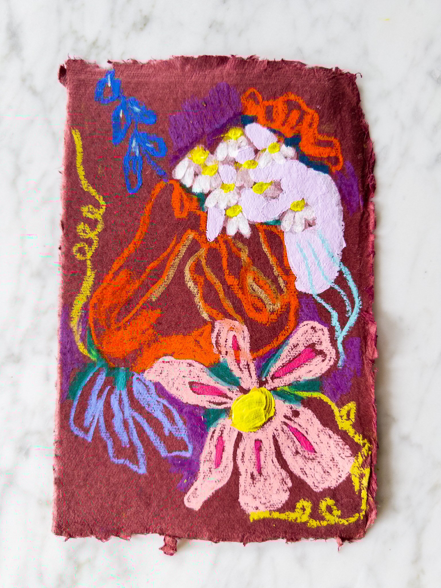 A view of my flower garden in oil pastel, acrylic, and pen marks on dark plum handmade paper.