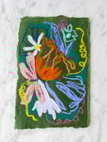 A view of my flower garden in oil pastel, acrylic, and pen marks on dark green handmade paper.