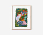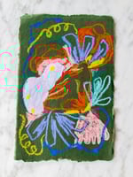 A view of my flower garden in oil pastel, acrylic, and pen marks on dark green handmade paper.
