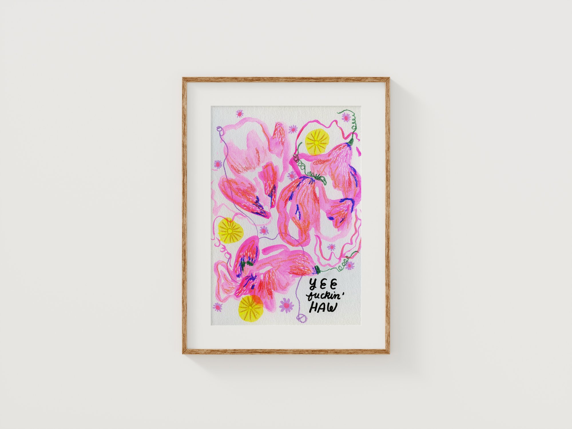 Original 5x7 gouache and color pencil painting on watercolor paper. Unframed. Ships flat. Neon pink is more vibrant in person.
